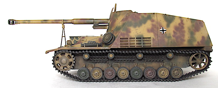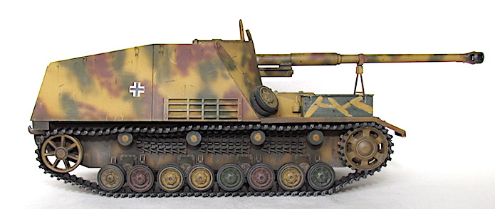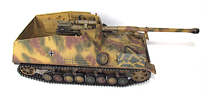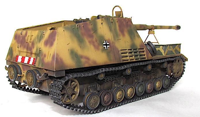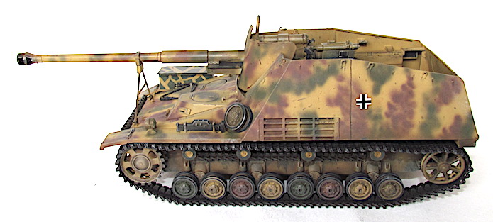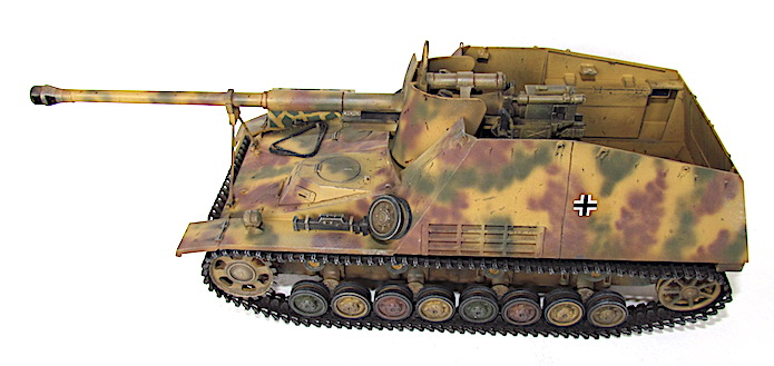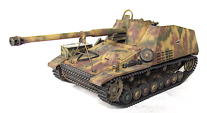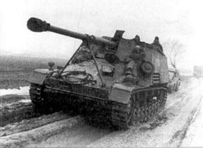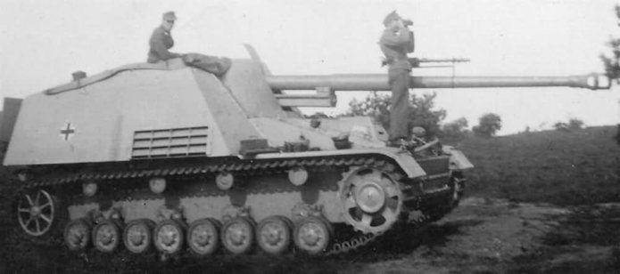 Le Nashorn (Rhinocéros) fut le premier canon automoteur pour missions spéciales adapté à un châssis, lequel unissait la coque et au train porteur du PzKfw IV l’omniprésent moteur Maybach TRM. Ce moteur fut déplacé vers l’avant, cette transformation permettant d’installer à l’arrière une véritable chambre de combat dont le plancher n’était pas trop loin du sol. Le moteur se trouvait alors directement derrière la transmission , l’ensemble formant un groupe propulseur bien commode, tout à côté du poste de conduite. Sur le front de l’Est, en 1942, la Wehrmacht avait à résoudre entre autres problèmes ceux que posait le déploiement du gros antichar de 8,8cm , le Pas 43/1. Sur affût tracté, la pièce , trop lourde , manquait de souplesse tactique. Mais comme elle représentait un élément essentiel dans le matériel défensif de l’armée, il fallait bien rassembler un grand nombre d’hommes et de véhicules pour faire passer un seul canon d’une position à l’autre. Cette contrainte suffisait à effacer beaucoup de ces avantages et il devint bientôt indispensable d’en faire un automoteur. Le châssis PzKfw III/IV fut choisi mais il était déjà trop lourd pour son train porteur et même avec les chenilles extra-larges réservées au front russe, la pression au sol ne permettait qu’un blindage symbolique, une fois le Pak 43 installé. De toute manière, l’Allemagne souffrait alors d’une grave pénurie d’acier et la plupart des Nashorn de série durent bon gré mal gré, recevoir, un blindage non trempé qui les rendait plus vulnérables encore.