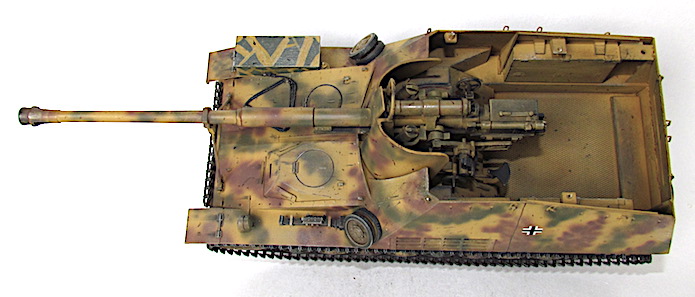 Une vaste chambre de combat se plaçait derrière le point médian du châssis et bien sûr, derrière l’affût du canon. Le tube se trouvait à plus de 2,24 m du sol, à la limite , au moins 0,6m plus haut que sur son affût cruciforme d’artillerie de campagne.En fait, le plus grand défaut du Nashorn résidait précisément dans cet excès de hauteur, lequel imposait l’emploi de grandes plaques latérales plus vulnérables, pour le blindage de la chambre de combat. Pour ne rien arranger, ces plaques ne pouvaient avoir pratiquement aucun plan oblique si l’on voulait maintenir un semblant d’habitabilité; toutefois, la plaque frontale montrait un bon profil balistique. Les persiennes du moteur donnaient au Gw III/IV un autre de ses traits distinctifs. Ces fentes d’admission se trouvaient sur chaque paroi latérale de la chambre de combat approximativement à micros de engin juste au-dessus des garde-chenilles. Elles faisaient légèrement saillie à l’intérieur de la chambre de combat pour permettre au caisson d’amener de l’air vers l’avant. Le Nashorn fut un vecteur tout à fait convenable pour le 88 mais il resta toujours trop exposé aux coups directs. 475 exemplaires sortirent des chaînes au cours de l’année 1944.