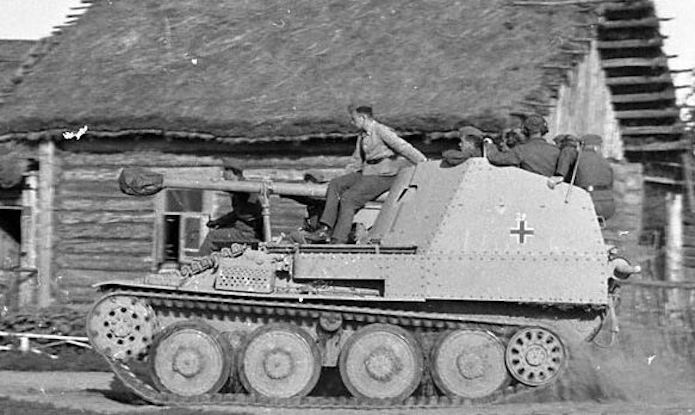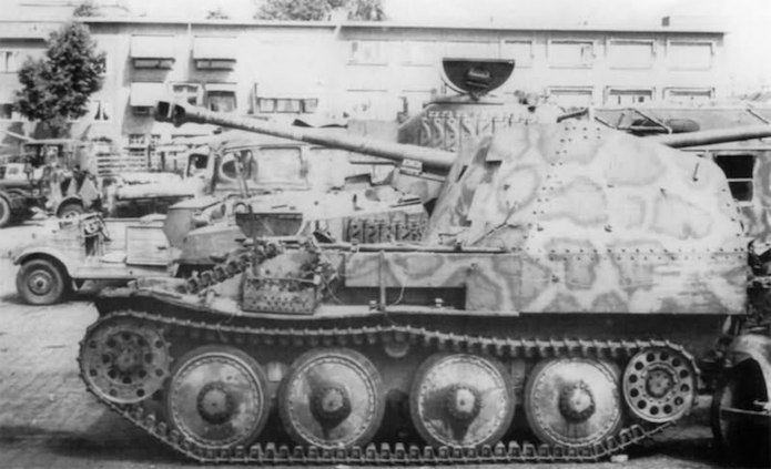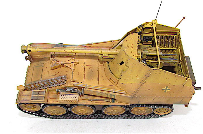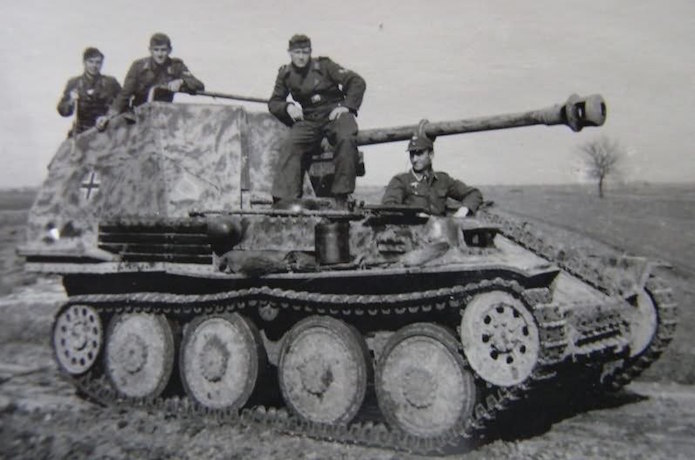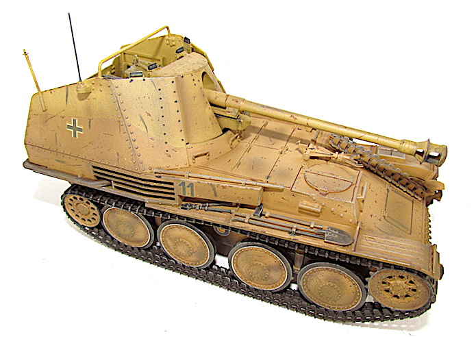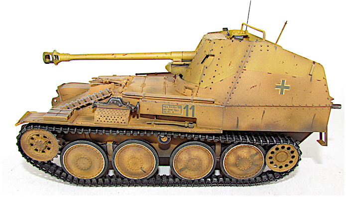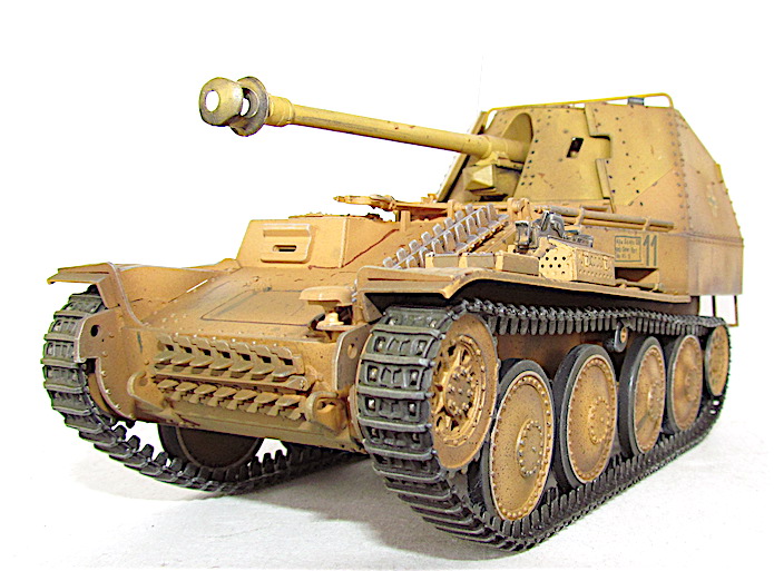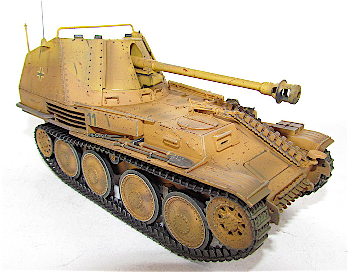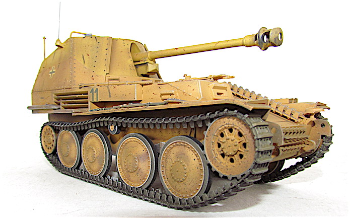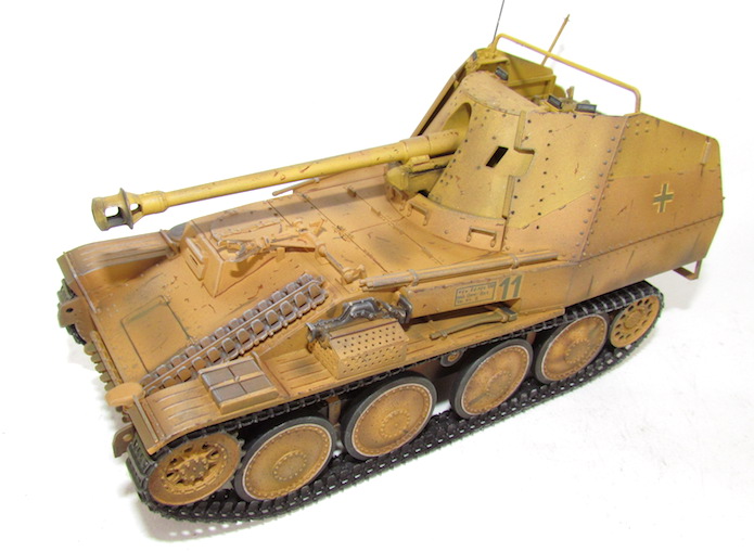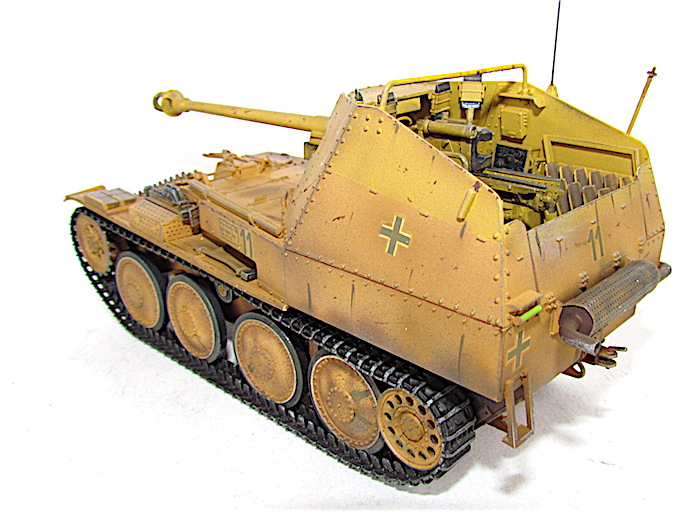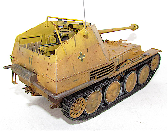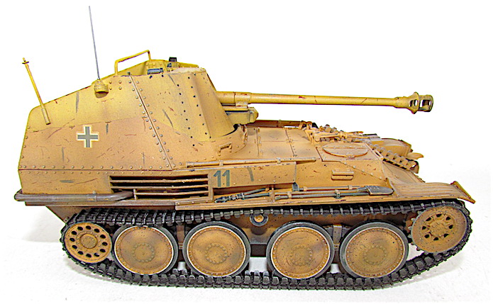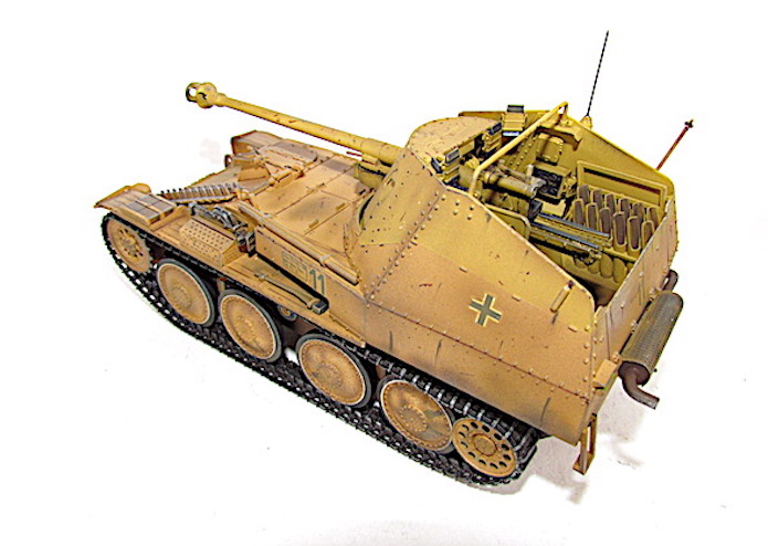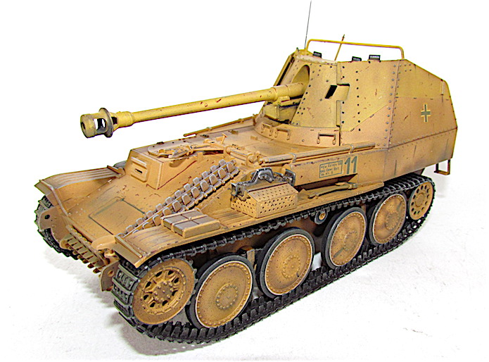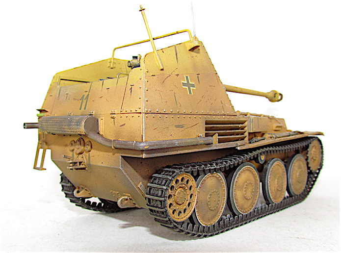 Durant la 2ème Guerre Mondiale, l’Allemagne utilisa de nombreux chasseurs de chars à caisse ouverte développés sur d’anciens châssis de chars obsolètes. La série des Marder III basé sur le châssis du char 38(t) de la firme tchèque CDK (plus tard BMM) fut développé afin de combattre les chars soviétiques T-34 et KV-1. La première version produite, le Marder III (Sd. Kfz. 139) armé d’un canon anti-char russe capturé de 7,62cm , apparut sur le terrain au printemps 1942. Bien que mis au point dans l’urgence, cet engin fit la preuve de ses capacités d’attaque en embuscade en Russie et en Afrique du Nord. A l’automne 1942, BMM développa le chasseur de char Marder III Ausf.H 38(t) équipé d’un canon Pak40/3 de 75mm capable de tirer des projectiles perforants ou explosifs. Celui-ci fut suivi de la version finale, le Marder II aussi. M (Sd.Kfz. 138). Contrairement aux modèles précédents dont le compartiment de combat était situé au centre du véhicule, le Marder III se caractérisait pa run poste de tir transféré à l’arrière et l’installation du moteur en position centrale, d’où l’appellation « M » (mitte = centre en allemand). Cette modification visait à accroître la cadence de production et faciliter l’utilisation opérationnelle de l’engin. Le poste de combat ceint de plaques de blindage était surbaissé et l’armement défensif était accru. 975 Marder III M furentt produits entre mai 1943 er juin 1944. A la fin 1943, le capot arrondi du conducteur en fonte à l’avant droit fut remplacé par des plaques de blindage soudées distinguant les modèles tardifs. D eplus, la protection d’admission d’air et le pot d’échappement furent modifiés. Plus tard, le chasseur de char Hetzer plus moderne pris la succession du Marder