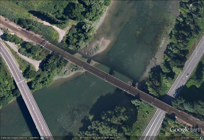 Vue rapprochée du pont ferroviaire d’Oissel. Elle confirme les destructions occasionnées à l’ouvrage. Cependant, un passage semble subsister en dessous du pont.