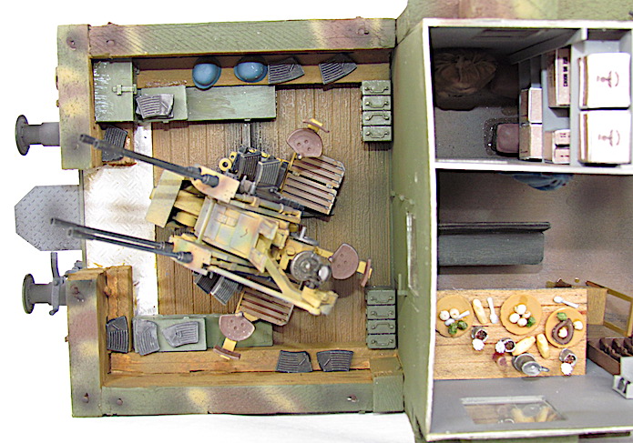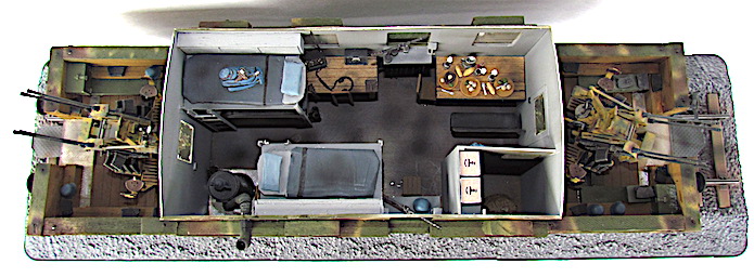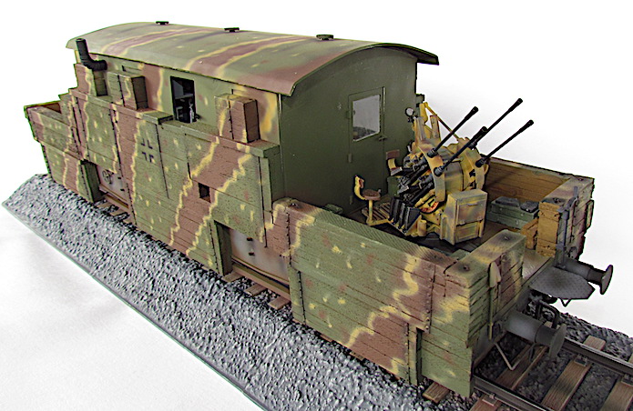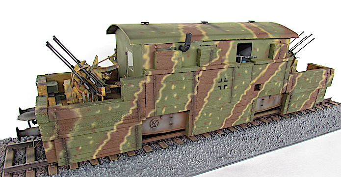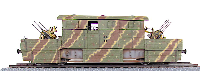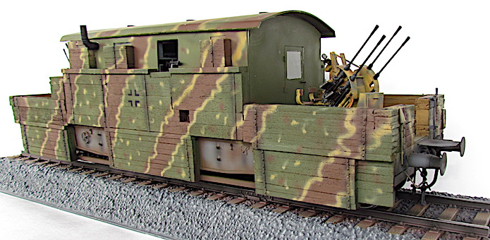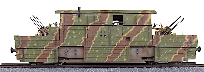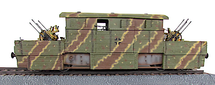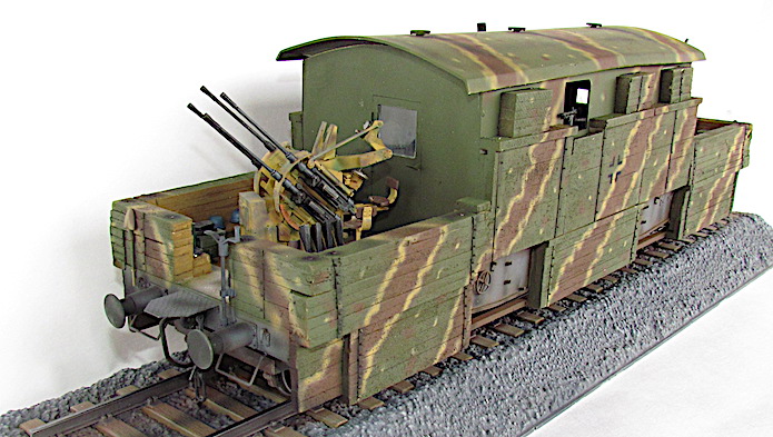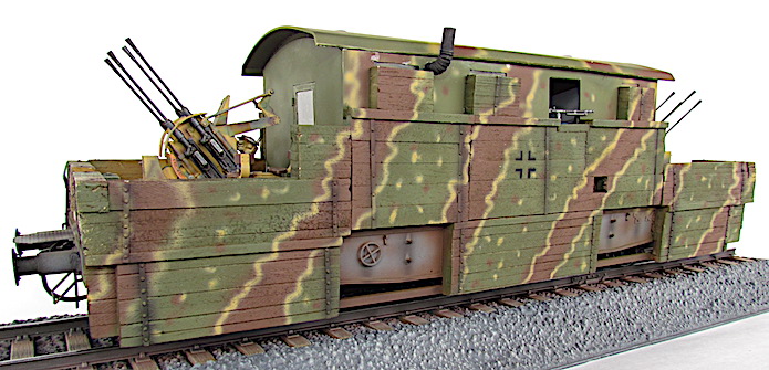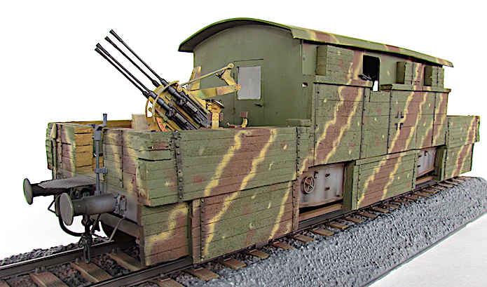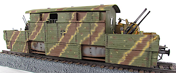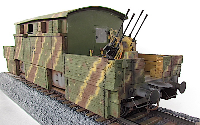 - Depuis le début de l’année, les trains circulant de jour dans la « zone pourpre » (200 kilomètres du front) sont généralement protégés par trois wagons de flak; un 37 millimètres en queue, un affût de 20 millimètres accroché immédiatement derrière ou parfois même devant la locomotive.