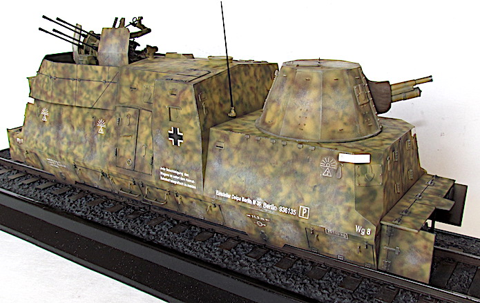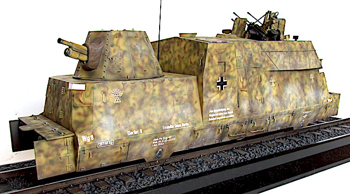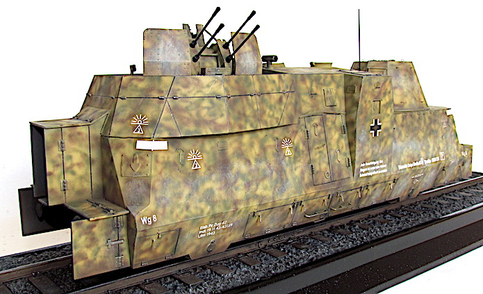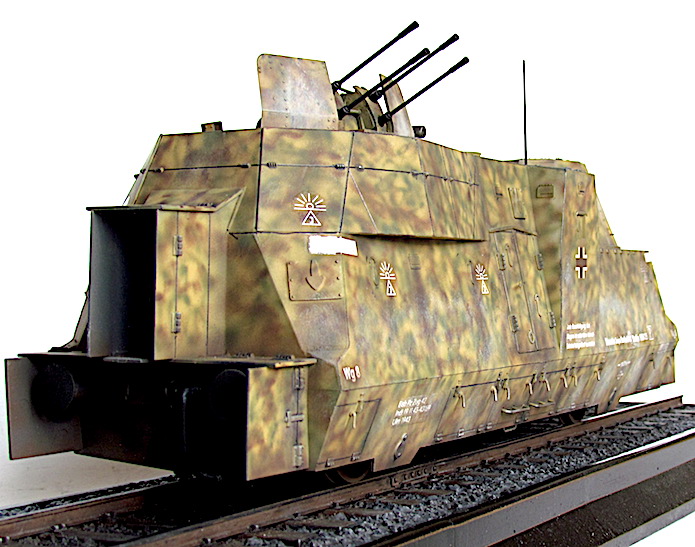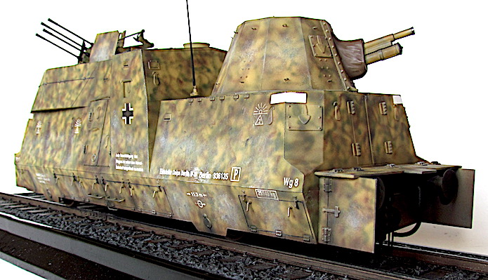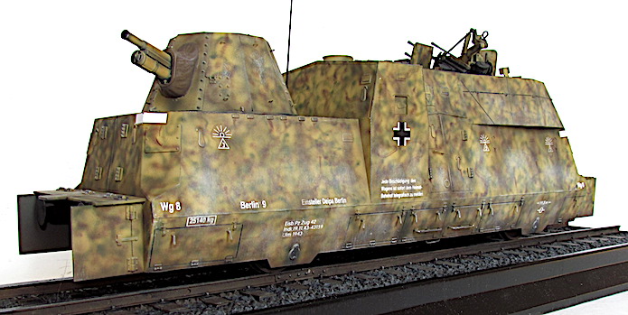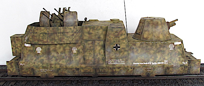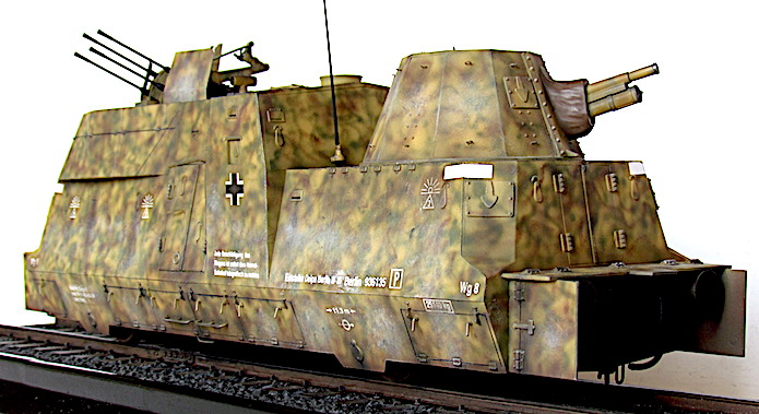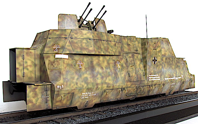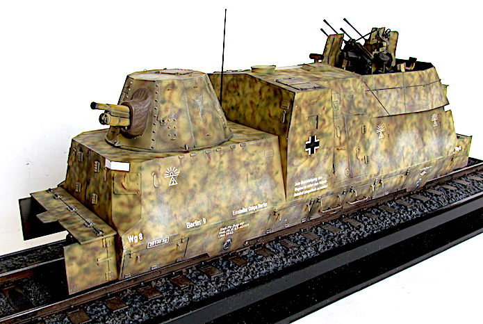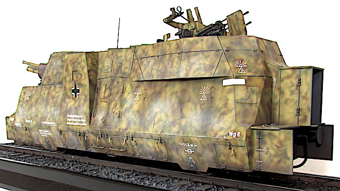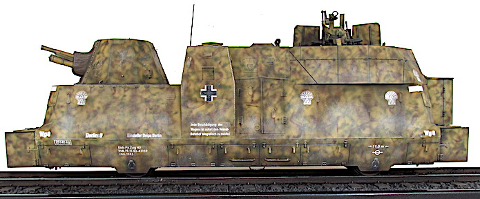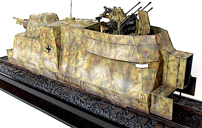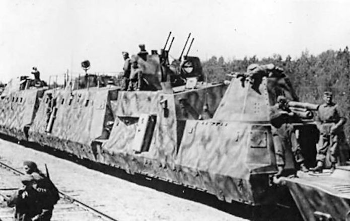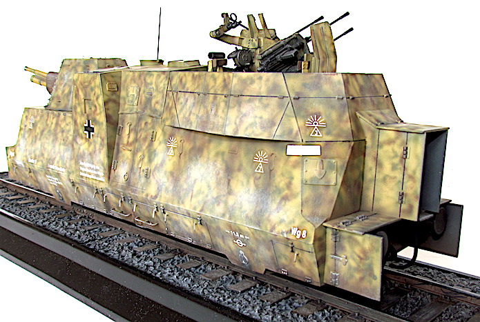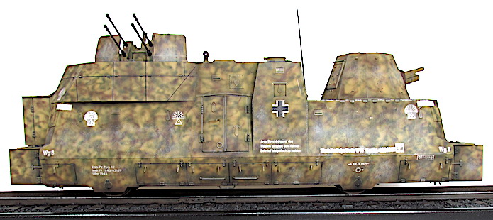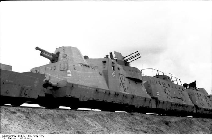 L’utilisation de trains blindés par l’armée allemande remonte à la Première Guerre mondiale. Ces trains avaient pour mission d’assurer la sécurité des voies ferroviaires indispensables au transfert des matériels et des hommes entres les divers fronts. Ces trains blindés étaient généralement composés d’un assemblage assez hétéroclite de divers wagons à bestiaux ouverts et/ou de tourelles blindées fixées à des wagons plats. Entre les deux guerres, les futurs belligérants mirent au point une nouvelle génération de trains blindés. Les voitures sont spécialisées : plateforme porte-chars, voiture radio, transport blindé pour l’infanterie. Elles sont dotées d’un blindage conséquent et équipées d’artillerie de campagne ou antichars sous tourelles ainsi que de canons ou d’affûts de mitrailleuses pour lutter contre la menace antiaérienne.