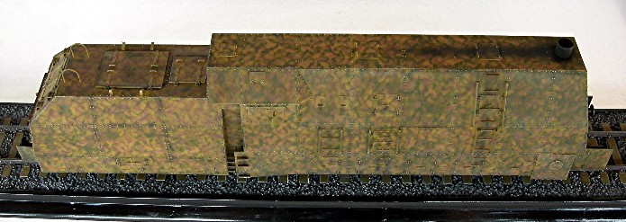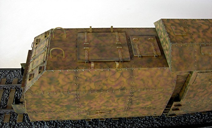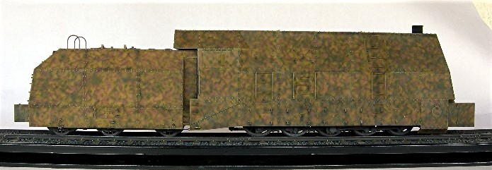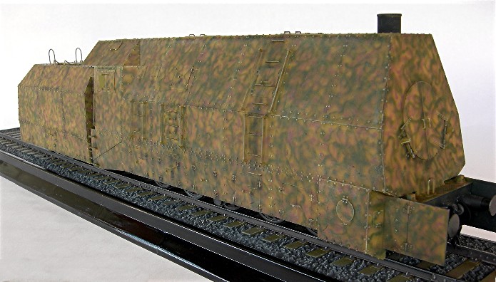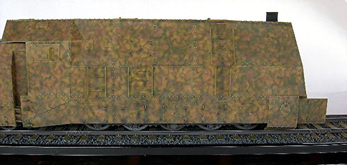 Bien plus lourd en revanche, l’armement du troisième modèle s’inspirait visiblement des » Libli italiens ». Avec deux boggies moteurs, ce dernier possédait à l’avant et à l’arrière deux tourelle de de Pz.Kpfw.IV H armées de pièce de 75 mm L/48 jumelées à des mitrailleuses. Au centre de la caisse, en superstructure, il y avait une tourelle fixe surmonté d’un tourelleau. Et naturellement sur cette automotrice puissamment blindée, de nombreuses trappes de tir permettaient l’usage d’armes automatiques.