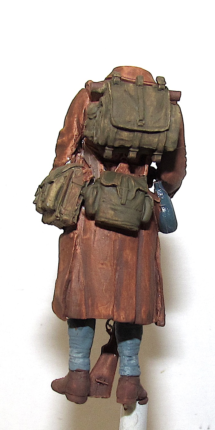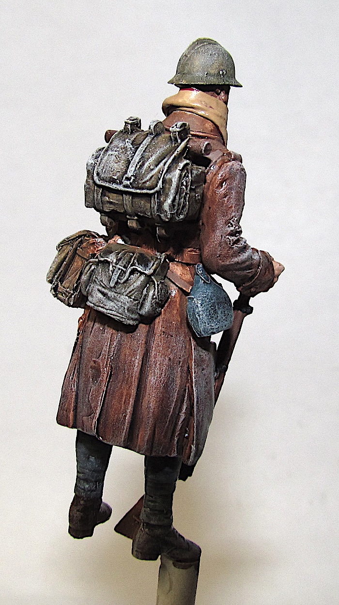 Un réserviste d’une division B, fatigué, en position hivernale, équipé de pièces réutilisées de 14–18 (pantalon , bandes molletières, bidon de 2 litres bleu horizon), engoncé dans sa capote lourde, avec son masque ARS, son bidon BH, ses guêtres et son fusil usé.