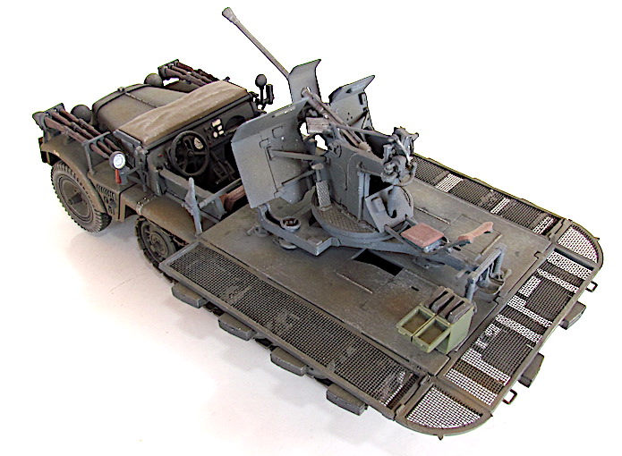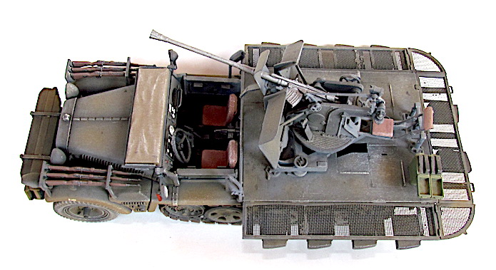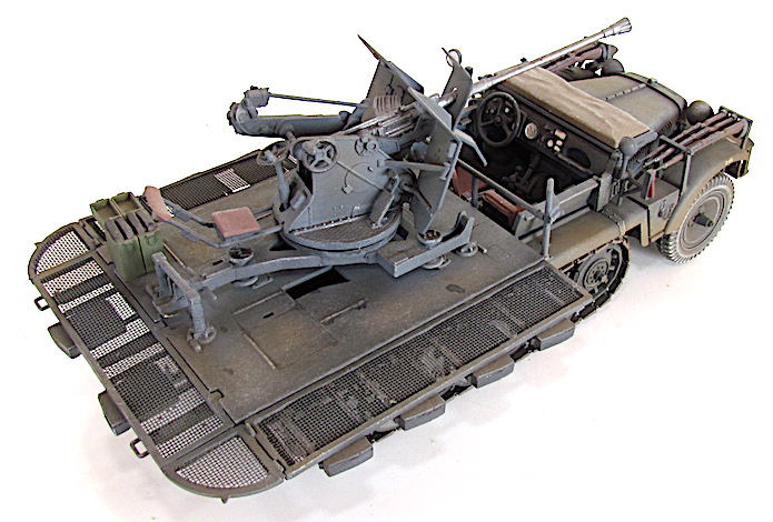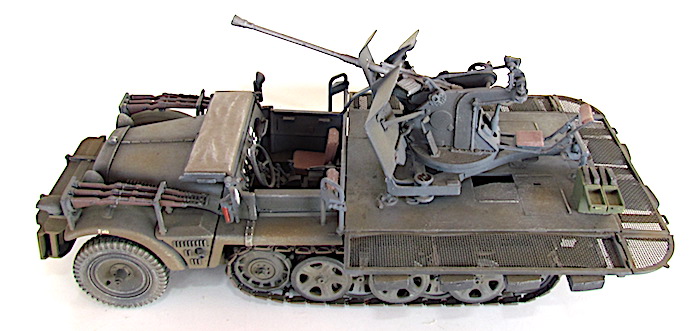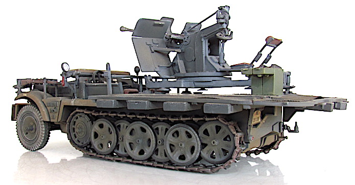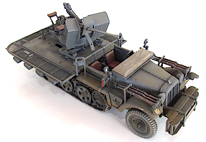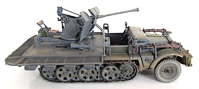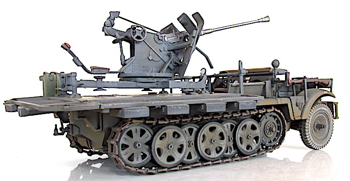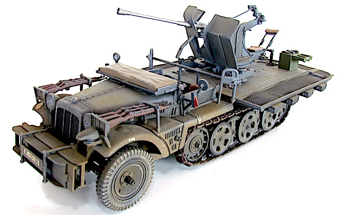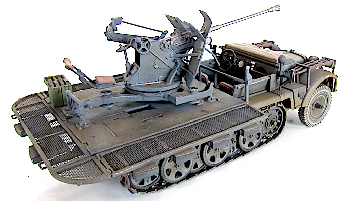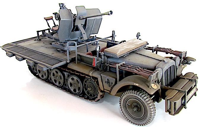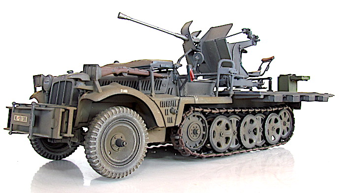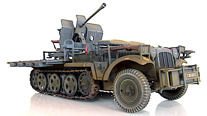 La version définitive du DEMAG D7 est sortie des usines en 1939. Baptisé Sdkfz 10, c’est unvéhicule semi-chenillé qui est équipé d’un train de roulement composé d’un barbotin, de 5 paires de bogies en quinconce et d’un galet de tension. Sa motorisation est un Maybach HL 42 de 6 cylindres. Cette motorisation et ce train de roulement donnent satisfaction et font du DEMAG un véhicule fort à l’aise dans les terrains difficiles. Décliné en plusieurs versions allant du transport de troupe au tracteur d’artillerie, le DEMAG sert aussi de véhicule pour le transport d’une plate-forme équipée d’un canon de 20mm Flak 30. Avec l’extension du conflit en Afrique et en URSS, les personnels servant des pièces d’artillerie tractées se trouvent confrontés à des problèmes de mobilité. Les déplacements sur les voies dites " carrossables " s’apparentent de plus en plus à du tout-terrain. C’est dans ce contexte que les semi-chenillés donnèrent la pleine mesure de leurs capacités de déplacement en terrain difficile. Cette capacité leurs permettait de rester dans le sillage des Panzer-Divisionen pour assurer la défense anti-aérienne et l’appui feu direct contre de l’infanterie ou des objectifs terrestres. L’un de ces véhicules, le Sdkfz 10/4, équipé d’une plate-forme où est arrimé un Flak 30 de 20 mm, offrait d’excellentes performances. Cette conversion robuste fit ses preuves durant toute la durée du conflit en particulier dans les difficiles conditions de circulation et de combat sur le front russe. Le Flak 30 servait aussi bien en défense anti-aérienne qu’en tir de soutien d’infanterie contre des véhicules blindés ou des positions fortifiées. Gros consommateur en munitions, l’approvisionnement du Flak se faisait par 10 boîtiers fixés sur les ridelles grillagées rabattables de la plateforme de tir. Chaque boîtier contenait 2 chargeurs. Une remorque porte munitions Sd ah 51 complétait cet apport initial.