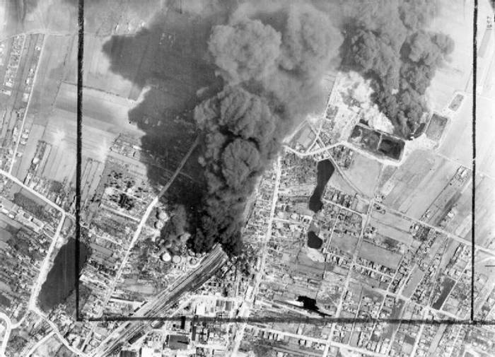 Document : Photographie aérienne verticale de la raffinerie de pétrole et des gares de triage de Campina, nord-ouest de Ploesti, Roumanie. Date inconnue. Après une première attaque matinale par des par by Handley Page Halifax and Vickers Wellington du 205 Group de la RAF. La fumée des réservoirs de stockage de pétrole en feu dérive sur le secteur de la cible, qui elle aussi a été aussi attaquée par les Consolidated Liberator de la 15th USAAF, La photo a été prise une heure et demi après l’attaque.