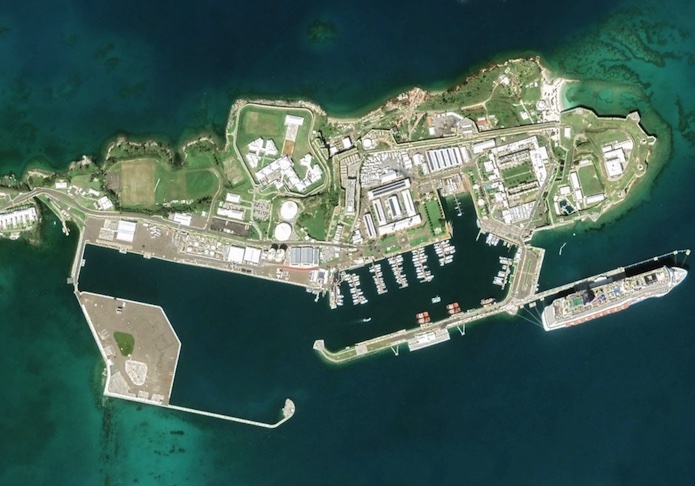 Vue aérienne de Fort Bell et de KindLey Field (US Army), sur St. David’s Island.