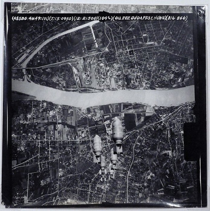 Document : Photographie aérienne verticale prise lors d’un bombardement d’une raffinerie de carburant dans la zone industrielle de Budapest.