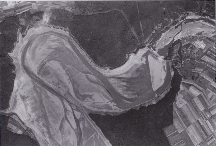Le barrage percé se trouve en haut à droite. Le grand bassin est complètement vidé.