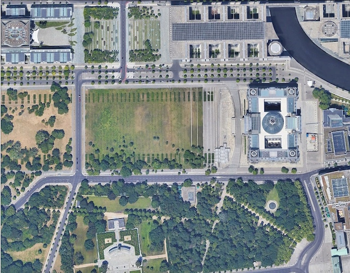 Sur le cliché apparaissent clairement le Reichstag et le fossé inondé qui coupe en deux la Königsplatz.