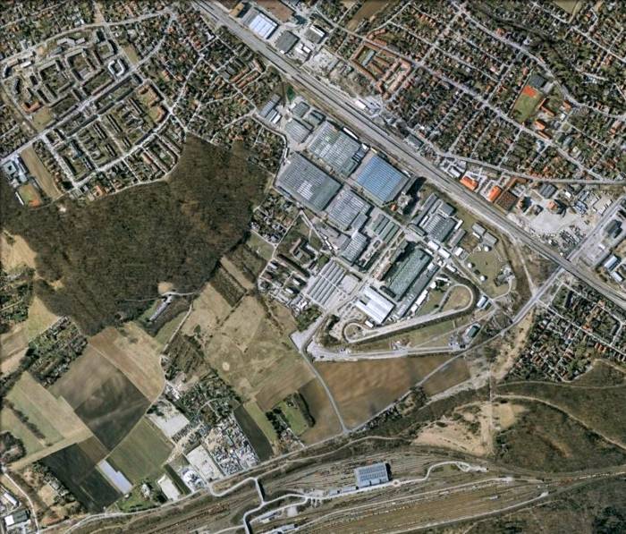 Deux bâtiments sont camouflés de façon unique. Sur la photo, se trouve le camp de travail annexe desservant l’usine. Il appartenait au complexe concentrationnaire de Dachau. Photo prise par le Lieutenant John S Blyth pilote au 14th Squadron du 7th Photo Group USAAF basé à Mount Farm, UK. Il volait sur le Spitfire Mk XI PL866 et son altitude était approximativement de 5 milles.