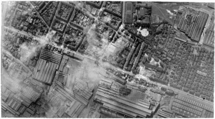 Document : Photographie aérienne verticale effectuée par un avion de reconnaissance suite au bombardement de l’aciérie et des usines d’armement Vereinigte Stahlwerke AG à Bochum. Le raid a été effectué dans la nuit du 13 au 14 mai 1943 par les appareils du Bomber Command. Lors du bombardement, plusieurs coups au but ont touché les bâtiments de l’usine, des fours et le laminoir. Mais, la zone résidentielle, attenante à la cible, a elle aussi été touchée et des maisons sont encore la proie des flammes.