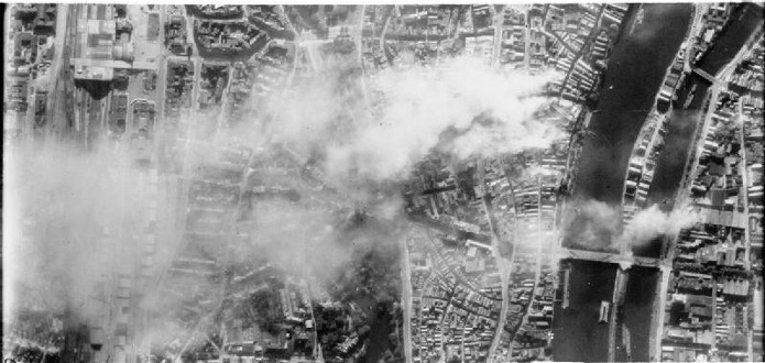 Une partie de la vieille ville brûle après avoir subi une attaque aérienne dans la nuit du 4 au 5 septembre 1942 par les appareils du Bomber Command. Cependant, la gare centrale et le Wilhelm-Kaiser-Brucke semblent intacts.