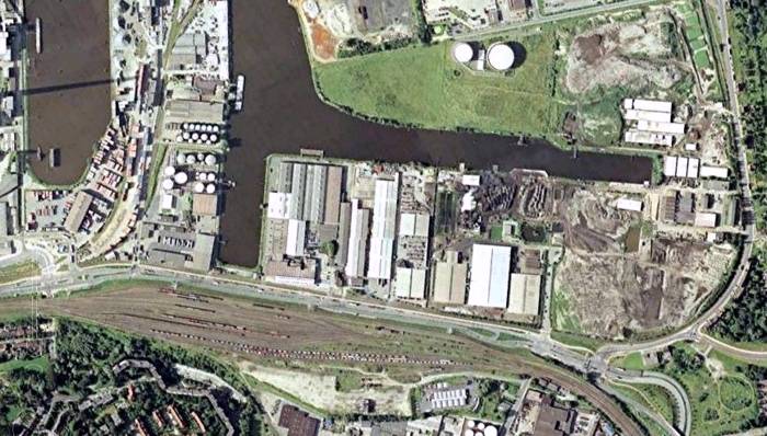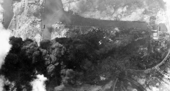 Document : Photo de reconnaissance aérienne verticale de la raffinerie et du dépôt de stockage Deutsche Vacuum AG à Brême, Allemagne. Cette photographie a été prise de jour le lendemain du bombardement effectué par les appareils des groupe n° 1 et n° 8 du Bomber Command. Une épaisse fumée noire et des flammes continuent à s’échapper des réservoirs touchés lors du bombardement.
