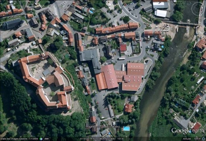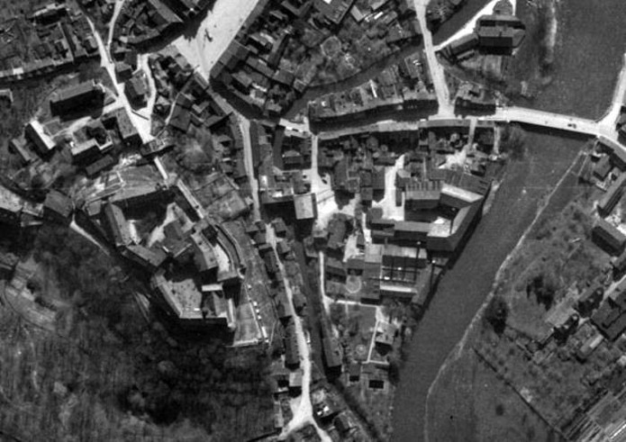 Document : Détail d’une vue aérienne verticale du château-forteresse de Colditz en Saxe. Le cliché a été pris le 10 avril 1945 trois jours avant l’arrivée des troupes américaines dans la région. On peut voir des prisonniers individuels à la photographie.