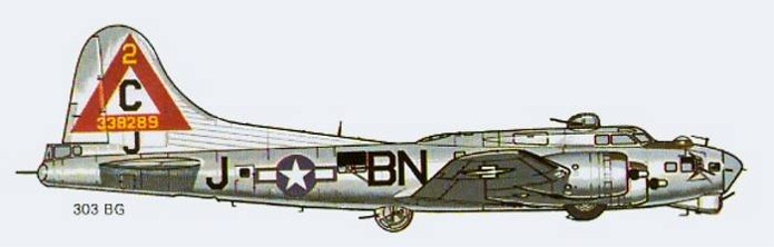 Un Boeing B-17 du 303rd Bombardment Group de la 8th Air Force survole sa cible « les usines de construction aéronautique Focke Wulf » de Kassel en Allemagne. L’impact des bombes créent des nuages de fumée au sol.