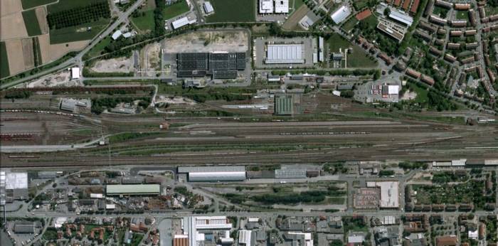 Photographie aérienne verticale de la gare ferroviaire d’Offenburg. Seize incendies consument les matériels de transport ferroviaire et empêchent la circulation sur les voies en gare d’Offenburg en Allemagne après le bombardement réussi par les Marauder de la 1st Tactical Air Force.