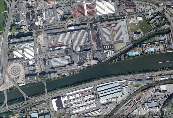 Document : Photographie aérienne verticale des usines Mercedes Benz de Stuttgart.