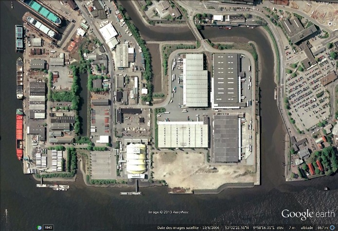 Document : Photographie aérienne verticale d’une partie du port de Hambourg.