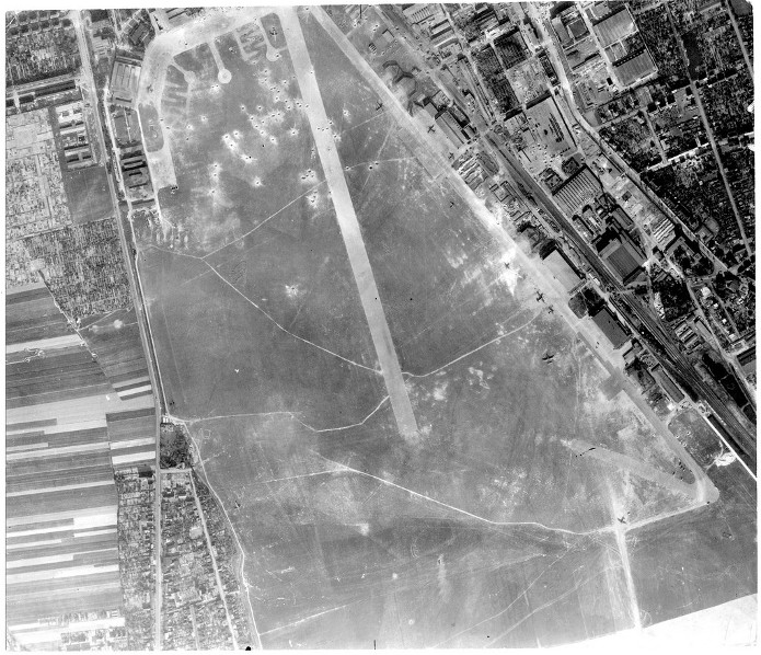 Cette photographie a été prise par le lieutenant John S Blyth du 14th Squadron, 7th Photo Group, Mount Farm UK. Il volait sur Spitfire Mark XI PA841. La photo a été prise à une altitude de 30,000ft le 30 mai 1944. L’aérodrome de Dessau desservait l’usine Junkers et était utilisé par la Luftwaffe. L’analyse du document montre des nombreux avions dont probablement un B-24 capturé. Un train d'atterrissage B-24 a été utilisé sur le prototype du JU 287 (bombardier à réaction). Les autres avions visibles peuvent être identifiés comme un JU 252 ou 352s, un HE 111, un JU-88s ou 188 et possible un HE 177.