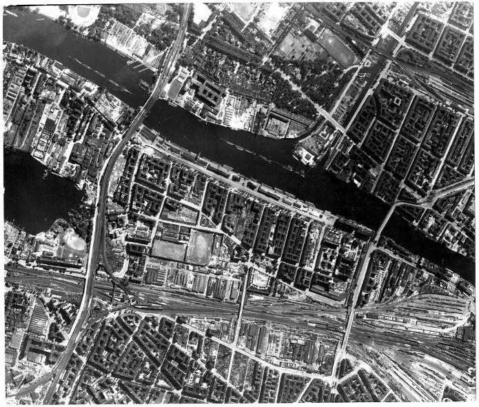 Document : Photographie aérienne verticale de la rivière Spree et du port intérieur Osthafen.