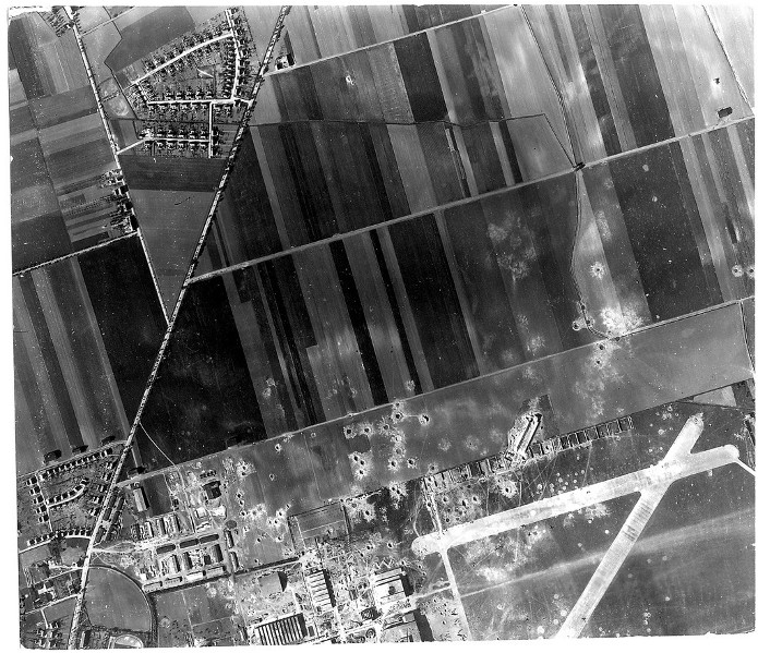 On distingue la piste de décollage et d’atterrissage ainsi que la piste secondaire de cet aérodrome allemand. Le site a été bombardé et on peut voir les cratères creusés par les bombes. Ce terrain appartenait l’usine Focke Wulf produisant principalement le FW190 à partir de 1941. Des avions sont visibles dont certains ont été détruits lors du bombardement. Des batteries de DCA assurent la protection du site.