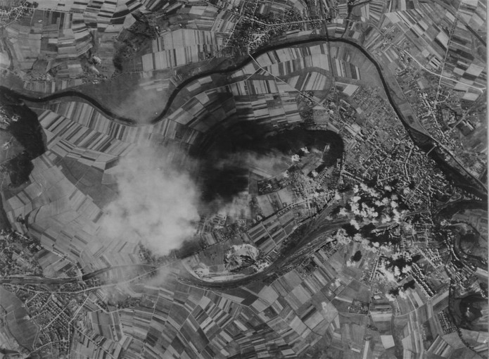 Document : Photographie aérienne verticale prise lors du bombardement de la gare ferroviaire.