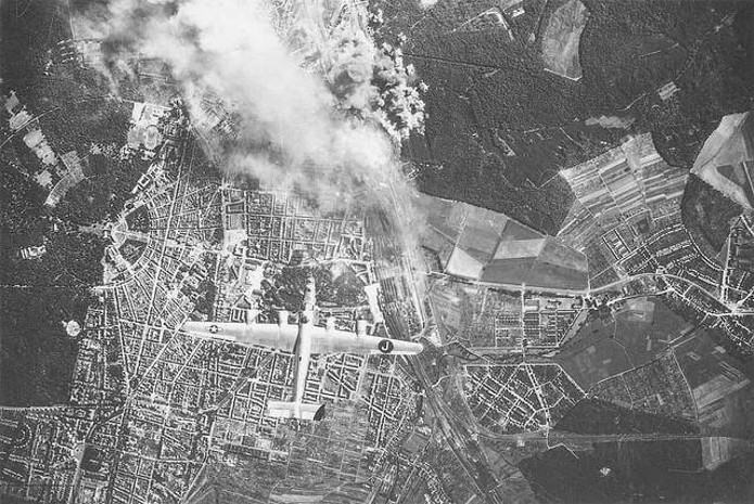 Un bombardier lourd quadrimoteur Consolidated B-24J du 453rd Bomb Group largue son chargement de bombes sur le centre-ville et la zone ferroviaire de Karlsruhe. Allemagne le 5 septembre 1944.