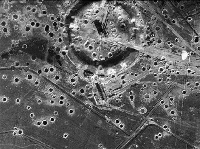 Ce document a été pris, probablement, par un appareil de reconnaissance après un bombardement assez précis au vue du nombre de cratères de bombes visible dans la zone photographiée.