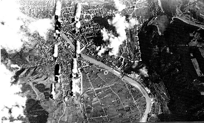 Il est 13h15. Un chapelet de bombes est lâché par un B-24 du 738th Bomb Squadron lors de la mission n° 137. Ce 20 octobre 1944, l’objectif est la gare de triage.