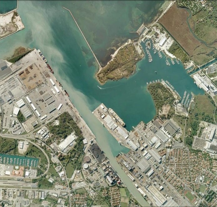 Un Consolidated Liberator B24 du 205th Bomb Group survole le port de Monfalcone lors d’une attaque aérienne de jour. Les installations portuaires, la zone de construction navale et des quais de réparation sont recouverts par la fumée dégagée par l’éclatement des bombes.
