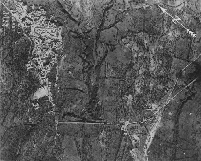 Cette photographie a été prise le 20 octobre 1943 par un appareil du 3rd Photographic Group américain à 9 000 mètres. On aperçoit distinctement le village de Sessa Aurunca et la voie ferrée rectiligne formant la base d’un triangle avec les routes de Teano et de Minturno.
