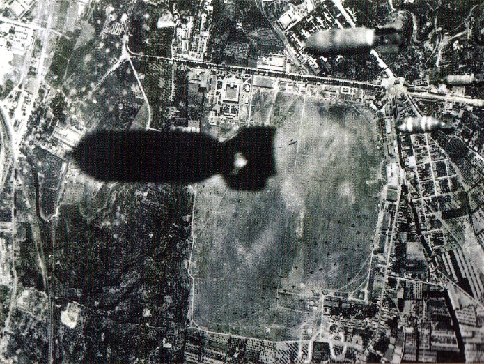 Cette photographie a été prise lors d’un bombardement aérien de la gare de triage de Naples qui se trouve à proximité de l’aérodrome. L’aérodrome est occupé par une cinquantaine d’appareils monomoteurs et de trois héxamoteurs de type M323.