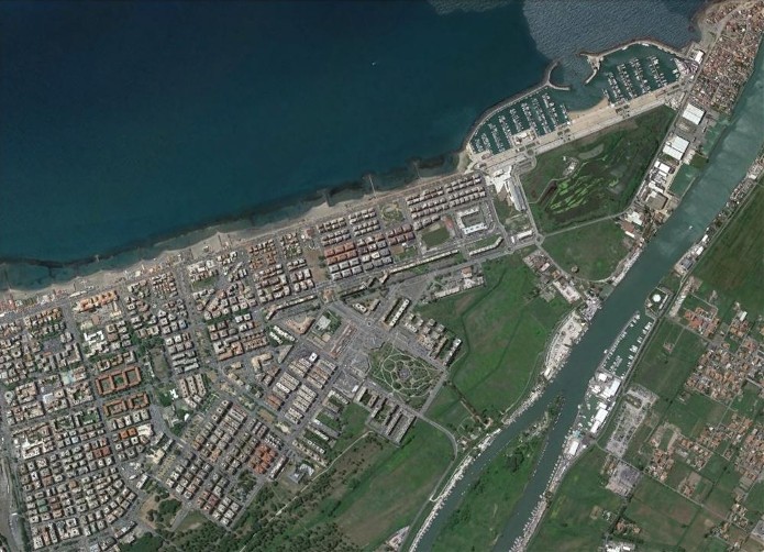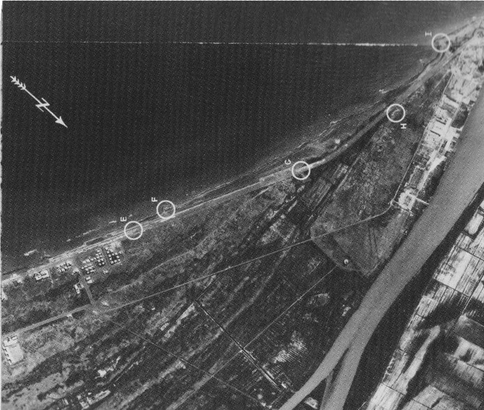 Photo aérienne prise de 8 500 m le 27 mai 1944 par un avion du 3rd Photo Reconnaissance Group américain. On distingue l’embouchure du Tibre ainsi que les premières maisons de Lido Di Roma