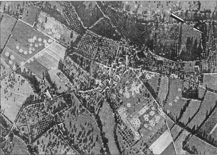 Photo aérienne de la Caine prise le 6 juillet 1944. On remarque que les impacts (petits points blancs) sont très dispersés, et que, sur les quelques 400 bombes larguées et tirs de roquettes effectués le 10 juin la Caine et ses environs, à peine une centaine ont atteint le village.