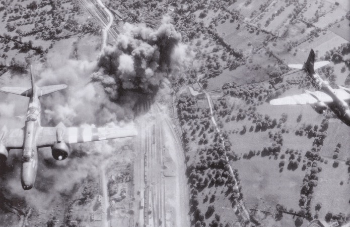 Deux bombardiers légers américains Havoc-20G du 671st Bomb Squadron (416th Group) attaquent la gare de Domfront dans l’Orme, afin de gêner le ravitaillement des unités allemandes. Il s’agit là d’une mission classique pour la 9th Air Force.