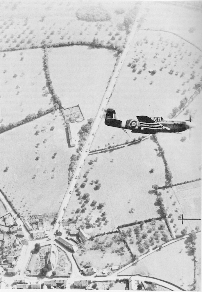 On aperçoit un Mustang de reconnaissance photographique survolant Pierrefitte en Cinglais. Le village normand est traversé par une colonne blindée allemande.