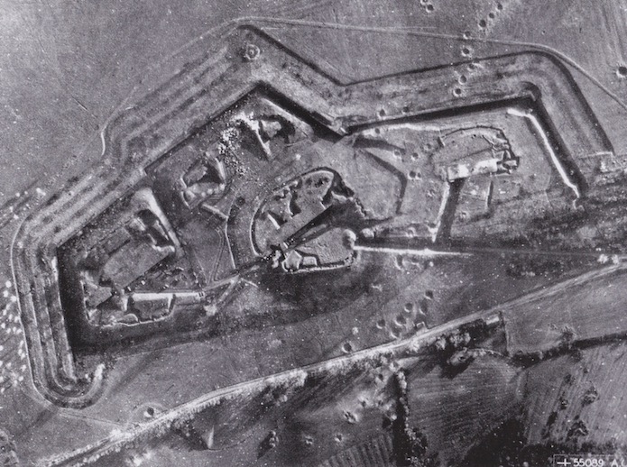 Cette vue aérienne a été prise début décembre 1944 et montre les effets des bombardements aériens sur les superstructures du fort. Les bombes se dispersent sur tout le terrain alentours et quelques impacts sont visibles sur le fort. En étudiant la photographie, on aperçoit les principaux obstacles qui protègent le fort : un triple réseau de barbelés et un profond fossé entourant tout le front de tête.