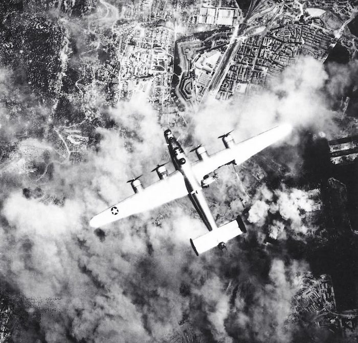 En survolant Toulon, ce bombardier lourd B-24 appartenant au 376th Bomber Group a eu une aile partiellement endommagée par un tir de la Flak.
