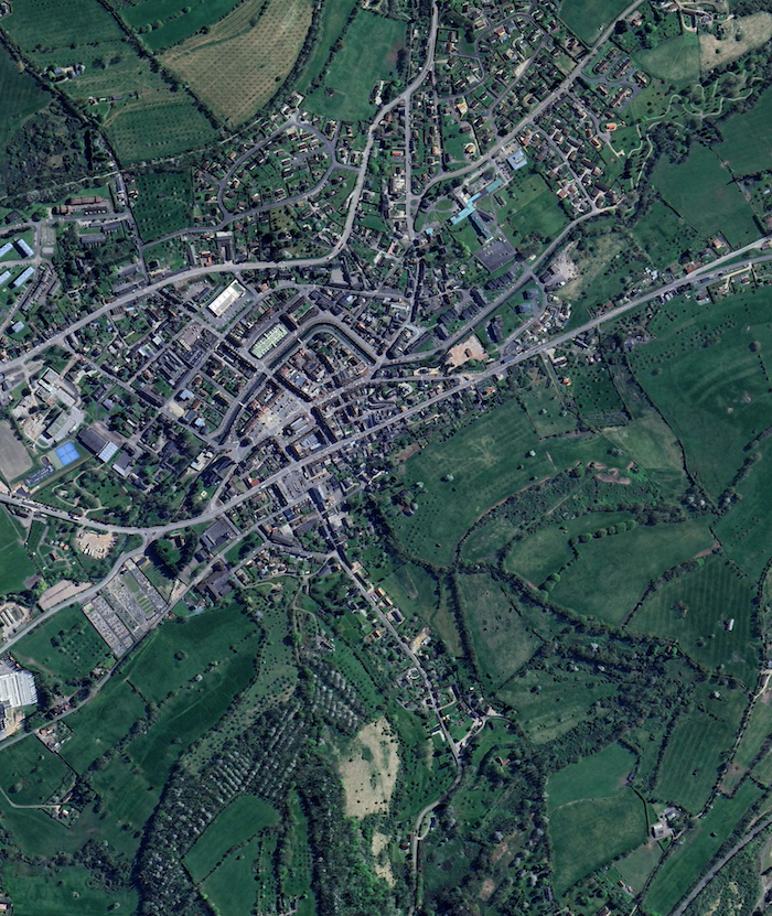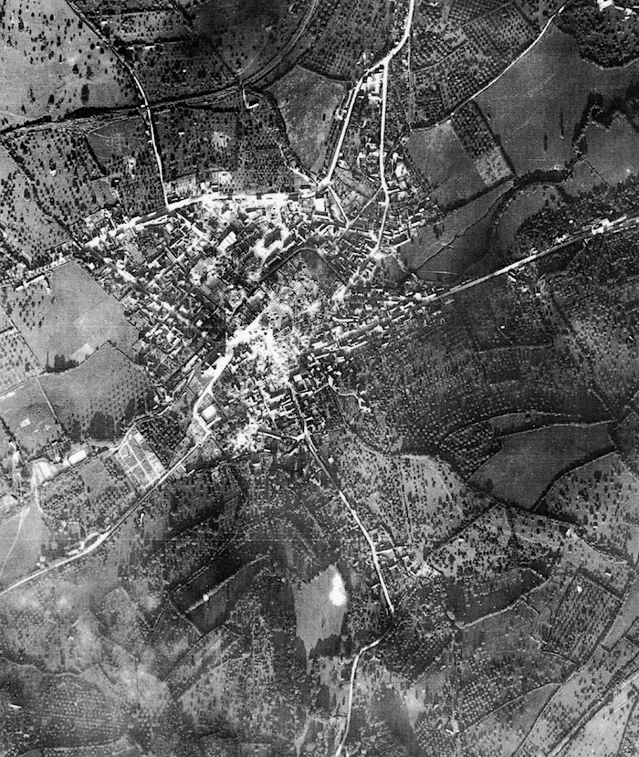 Document : photographie aérienne verticale de Vimoutiers prise le 17 juin 1944 par l’aviation américaine après les bombardements du 14 qui en réduisirent en ruines une bonne partie de la ville et firent plus de 200 morts en quelques minutes.