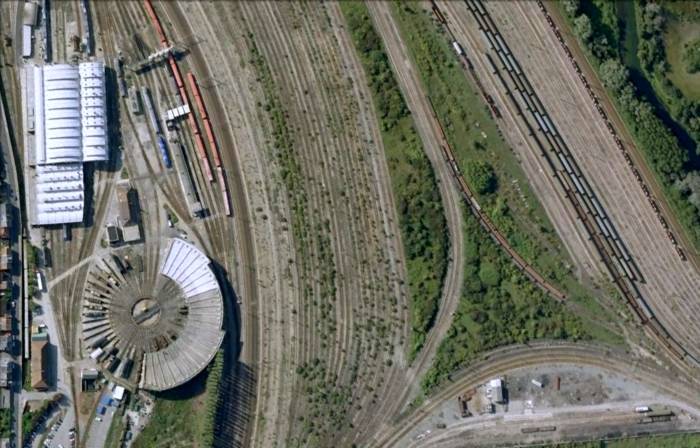 Cette photographie aérienne britannique officielle montre une section de la gare de triage d’Amiens après les bombardements lourds du mois de Mars 1944. De nombreux cratères se chevauchent là où se situaient les voies ferrées. Deux rotondes d’entretien de locomotives sont pratiquement détruiteset des dégâts importants sont visibles sur le garage à locomotives situé au bas de la photographie. Le matériel roulant a lui aussi été sévèrement touché.