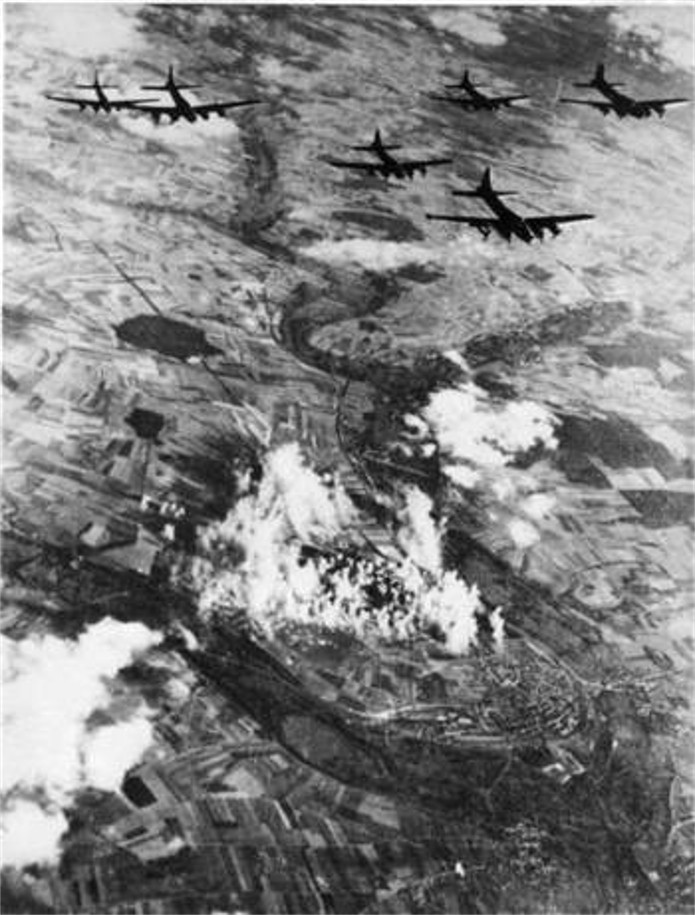 Cette photo, probablement une vue des plus parfaite d’un bombardement aérien nous montre une formation de B-17 de la 8ème Air Force des Etats-Unis en opération au-dessus de l’aérodrome à Amiens-Glisy, en France. Tenu par les nazis, cet aérodrome, cible du 31 aout dernier, est une importante base de la chasse allemande. Le contour de la zone est clairement délimité par les colonnes de fumée engendrées par l’explosion des bombes larguées par les "les Forts" américaines. Les armées de l'air alliées basées en Grande-Bretagne, se concentrent prioritairement sur la côte d'Invasion . Les raids ciblent particulièrement les usines d'avion et les terrains d'aviation en France. Ces opérations de « ramollissement » peuvent être interprétées comme un prélude à l’invasion.