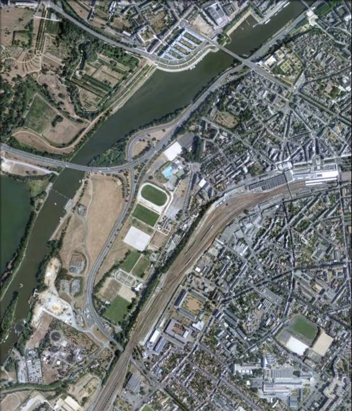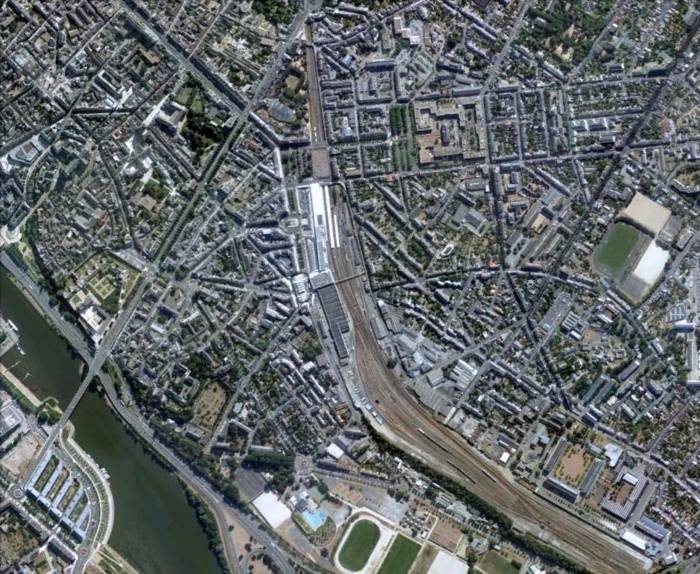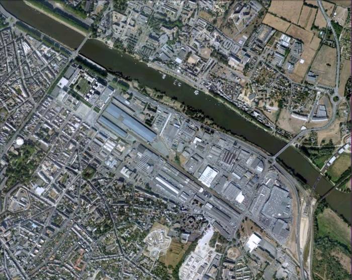 Sur la photo prise à une altitude avoisinant les 2300m, on distingue nettement la gare ferroviaire d’Anger.
