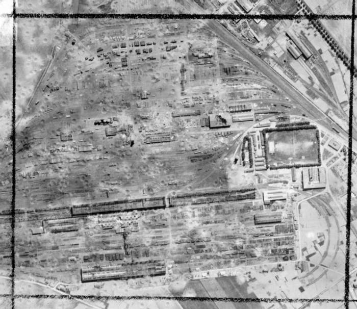 Document : Photo de reconnaissance aérienne verticale du dépôt et de la station de réparation ferroviaire de Chambly en France.