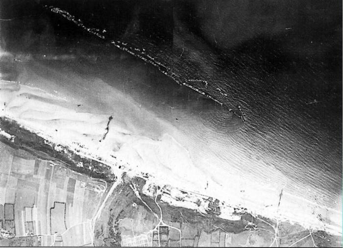 Document : Vue aérienne verticale du Gooseberry « 2 » en 1945. On aperçoit la plus grande partie des éléments immergés en juin 1944 devant Saint- Laurent- sur- Mer. Le port artificiel américain Mulberry « A » fut entièrement détruit par la tempête qui sévit du 19 au 22 juin 1944. Frappé de plein fouet en cours de construction, vu l’ampleur des dégâts, il fut impossible de le réparer. Sur le document on aperçoit, au centre en bas, l’ébauche du cimetière militaire américain.