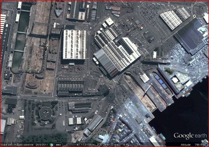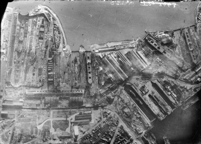 Documents : Photographie aérienne verticale prise par un avion de reconnaissance au-dessus de Saint- Nazaire. Le port fut bombardé par une formation importante de 437 avions du Bomber Command dans la nuit du 28 février/1 mars 1943. Des dégâts considérables sont visibles dans les bassins de construction navale et les installations des docks des Ateliers et Chantiers de Saint-Nazaire.