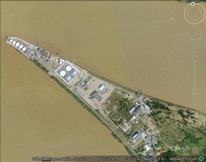 Document : Photographie aérienne verticale prise lors d’un bombardement de jour du dépôt de stockage de pétrole du Bec d'Ambes. Ce dépôt se situe au confluant de la Garonne et la Dordogne en France.