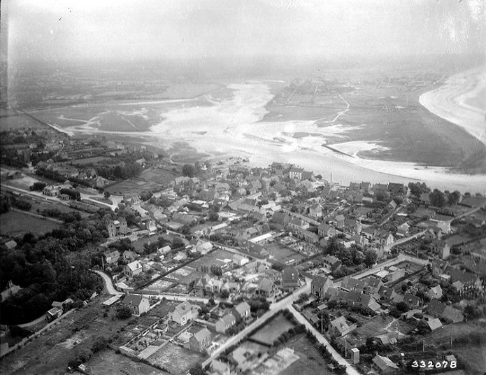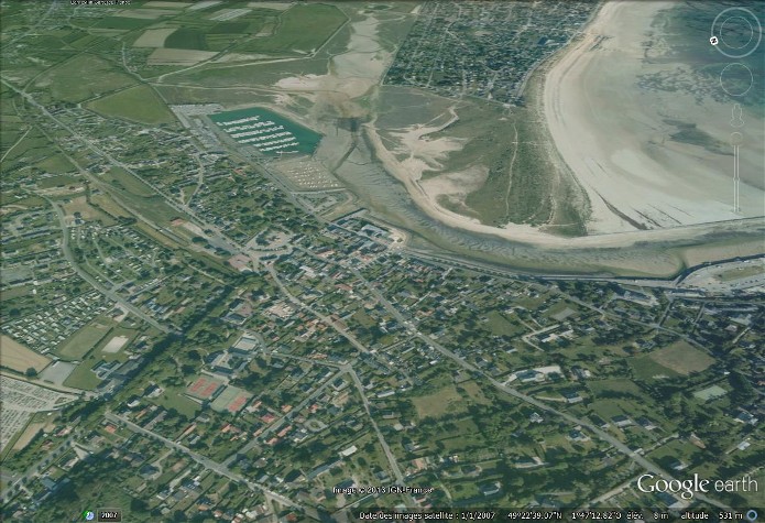 Carteret au premier plan, le Nord est en bas de la photo, à droite Barneville Plage et la Manche, au centre Le Havre de Carteret.