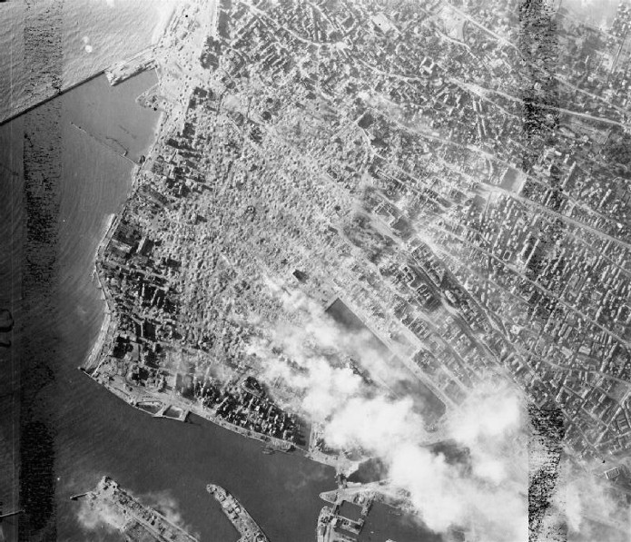 Sur la photographie, on aperçoit une zone entièrement dévasté dans le centre-ville à l’ouest du bassin du commerce. De la fumée s’élève encore au-dessus des ruines qui continuent à se consumer. La ville et ses abords immédiats ont eux aussi subit trois jours de raids massifs dans le but d’affaiblir les défenses allemandes.
