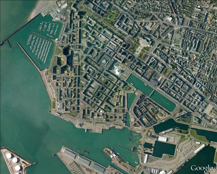 Photographie aérienne du port du Havre prise de jour après la série de bombardements effectuée sur la ville les 5,6 et 8 septembre 1944.